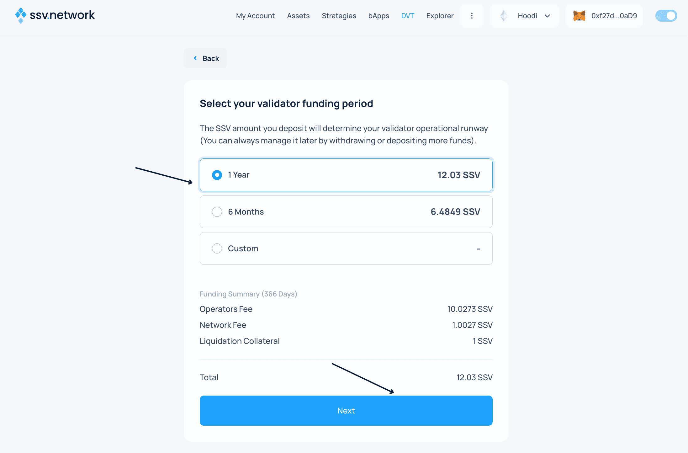 - Choose your funding period. The required SSV amount depends on your selected operators' fees and duration.