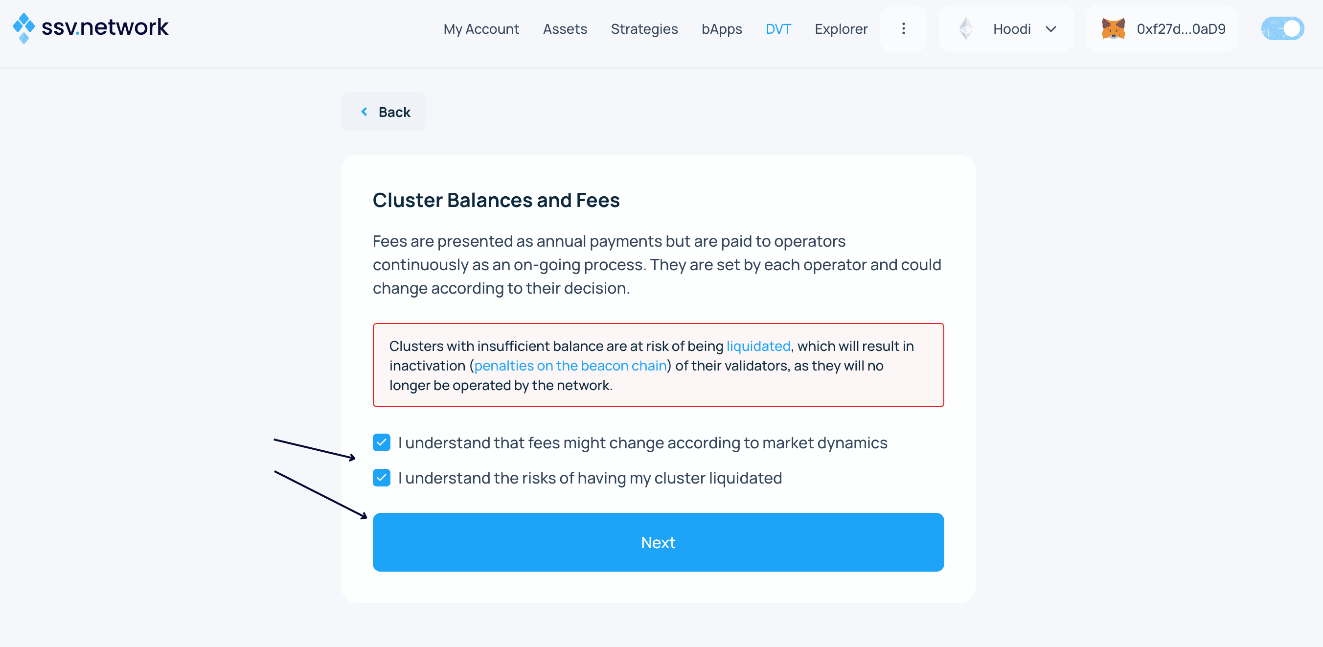 Understand how fees are managed ↗ and keep your cluster balance above the Liquidation Collateral threshold. If liquidated, your validators will stop being operated, which could lead to penalties on the Beacon Chain. Learn more ↗